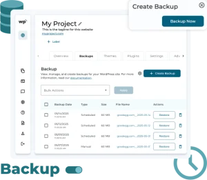 What it does for you: This provides an essential safety net. In the event of an unforeseen issue, accidental deletion, or a security incident, you can easily restore your website to a previous clean state with just a few clicks from your control panel, minimizing downtime and data loss. Extended retention options are also available as an add-on.
