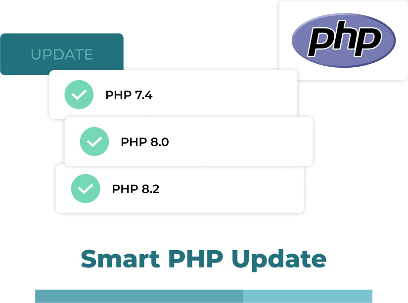 What it does for you: Choose the optimal PHP version for each of your WordPress sites to ensure compatibility and performance. Our Smart PHP Update feature even allows you to test compatibility before applying updates, preventing potential issues and ensuring smooth transitions.